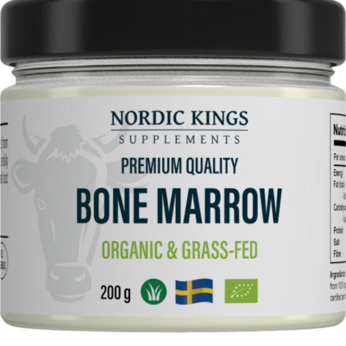 Nordic Kings Premium Bone Marrow är benmärg som kommer från gräsbetande nötdjur och är ett rent ekologiskt fett som är rikt på fettsyror, naturligt E-vitamin, kollagen, glycin, glukosamin och kondroitin. Denna benmärg är ekologiskt certifierad och kommer från djur som enbart betar på 100 % gräs och örter, utan tillskott av spannmålsfoder som soja, vete eller majs. Benmärg Gräsbetad innehåller inga tillsatser, utfyllnadsmedel eller bindemedel. Benmärgen extraheras varsamt genom försiktig uppvärmning och filtrering för att separera fettet från den kvarvarande bindväven. Resultatet är ett rent fett som stelnar vid rumstemperatur.