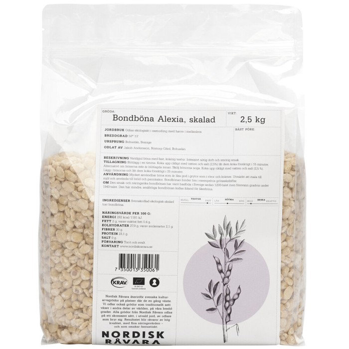 Nordisk Råvara skalad bondböna är en mycket användbar böna som är lika god i grytor som i röror och krämer. Bondbönan binder bra i exempelvis grönsaksbiffar.
