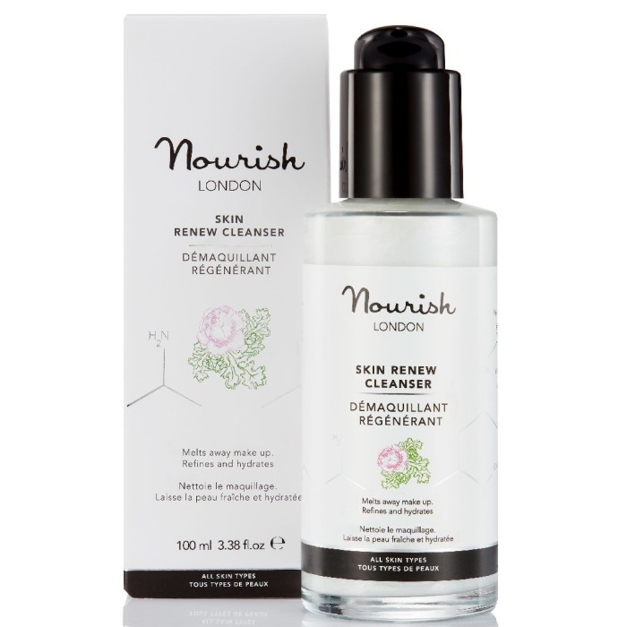 Skin Renew Cleanser & Makeup Remover från Nourish London är en rengöringskräm som "lyfter bort" orenheter och makeup. Rengöringen har en mjuk känsla och innehåller argan-, jojoba- och boragoolja samt Nourish Londons unika grönkålsextrakt för att avlägsna makeup, förfina och återfukta huden. Hjälper till att återställa hudens naturliga lipidbarriär samtidigt som den skyddar huden från föroreningar i vår omgivning.