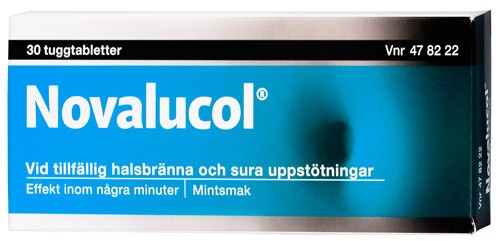 Novalucol tuggtablett används vid tillfällig halsbränna och sura uppstötningar.