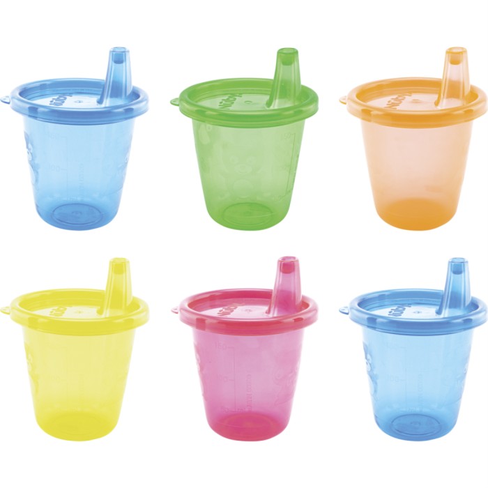 6 st färgglada drickmuggar med hård pip och stabilt lock. Muggen rymmer 210 ml. För barn från 9 månader.