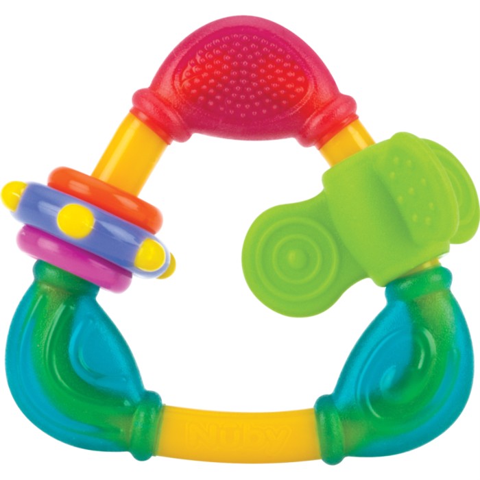 Nuby Triangle Teether för barn från 6 månader är en bitleksak med snurrande delar och glada färger. Bitytorna ger stimulans vid kliande tandkött, och hela leksaken ger stimulans för både gom och tunga.