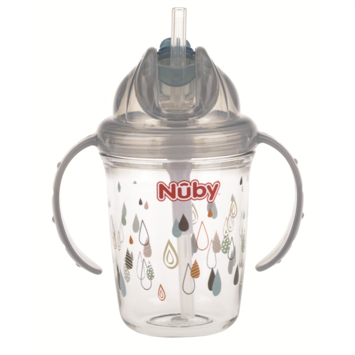 Nûby Twin Handle Flip-It är en mugg med spillfri design och ett sugrör i silikon. Muggen har ett greppvänligt handtag och Variflow som låter barnet styra vätskan i ett jämnt flöde. Rymmer 240 ml. Passar för barn från 12 månader.
