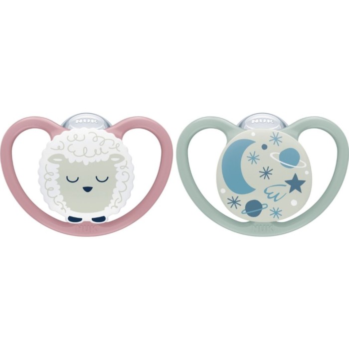 NUK Space Night är en ortodontiskt utformad napp som passar det lilla barnets anatomi. Ovansidan av sugdelen lägger sig mjukt mot gommen, och undersidan lämnar plats för tungans naturliga sugrörelser. Eftersom sugdelen är smal och platt blir det nästan ingen belastning på tänder, käke eller gom. NUK Space-nappen har en design med NUK Air System som gör att luften kan strömma fritt genom sugdelen, vilket gör att nappen behåller sin form när barnet suger. Designen gör nappen extra bra för barn med känslig hud. Skölden på nappen är formad som ett hjärta för att passa perfekt under barnets näsa.