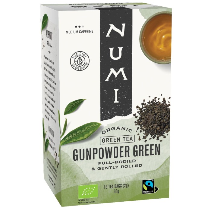 Numi Organic Tea Gunpowder Green Full-Bodied är ett grönt ekologiskt te med en mjuk och fyllig smak. Inom timmar efter att ha plockats rullas de gröna tebladen till små pärlor på en wok. Detta bevarar teets mjuka och fylliga smak och arom längre än andra gröna teer.