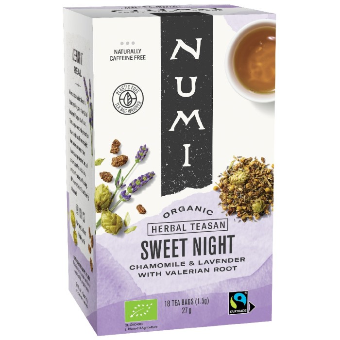 Numi Sweet Night Valerian Root är ett naturligt koffeinfritt örtte med kamomill, lavendel och valerianarot. Sweet Night Valerian Root passar bra att dricka på kvällen. Teet är ekologiskt och Fairtrade-märkt. Kamomillen i Sweet Night kommer från Numis Fairtrade-certifierade samarbetspartner i Fayoum, Egypten, där alla arbetare ges ägarskap i företaget.