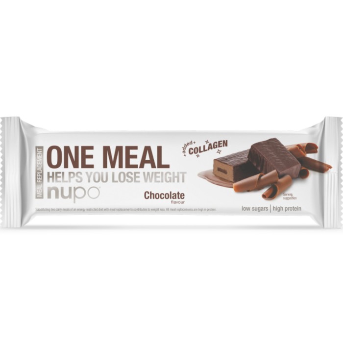 Nupo One Meal Bar Chocolate Collagen är en måltidsersättningsbar för viktnedgång och viktkontroll. Kan tas som ett mål när du är språng. Har ett högt innehåll av protein och fibrer och är avsedd att bidra till att upprätthålla en hälsosam livsstil. Innehåller 200 kcal per bar. En bar innehåller 3000 mg marint kollagen. Innehåller sötningsmedel.