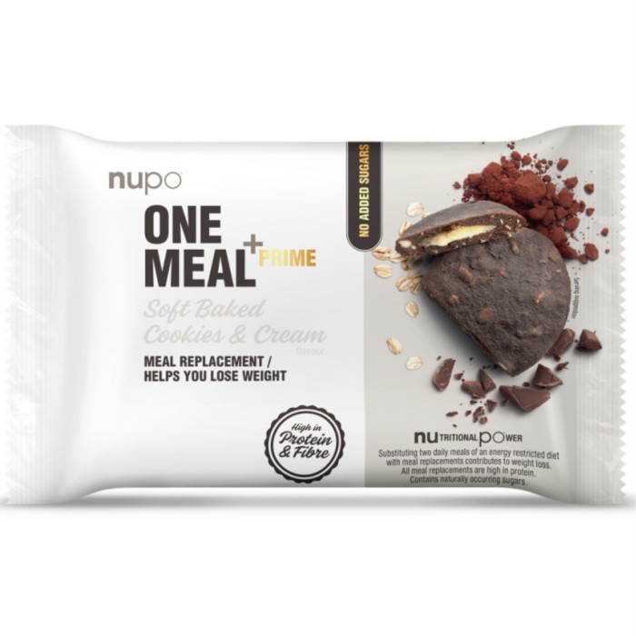 Nupo One Meal + Prime Soft Baked Cookies & Cream är en bakad måltidsersättningsbar för viktminskning och viktkontroll. Nupo Cookies & Cream har en smak av mörk choklad med en fyllning av smör och grädde. Innehåller sötningsmedel. 244 kcal.