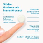 Ingredienser: Fyllnadsmedel: isomalt; bakteriestam: Lactobacillus salivarius; Ytbehandlingsmedel: mono- och diglycerider av fettsyror, magnesiumsalter av fettsyror; naturliga aromämnen, surhetsreglerande medel: citronsyra; vitamin D3, sötningsmedel: steviolglykosider. Produktens ingredienslista kan uppdateras över tid. Konsultera alltid ingredienslistan som finns på den köpta produktens förpackning.