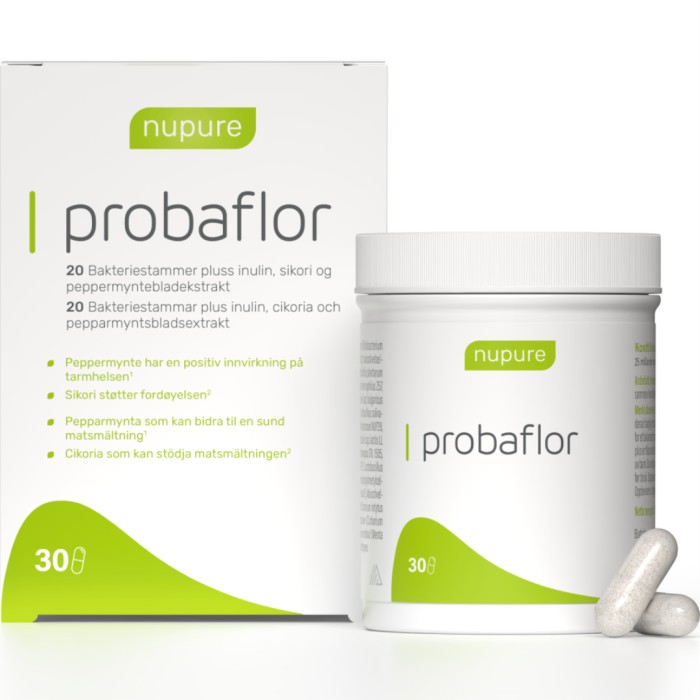 Nupure Probaflor är ett kosttillskott med 20 stammar av mjölksyrabakterier och innehåller 25 miljarder levande bakterier. Kapslarna innehåller även inulin, cikoriarot och pepparmynta. Kapslarna har en beläggning som gör att de passerar genom den sura miljön i magen utan att öppna sig, så att mjölksyrabakterierna når tarmen. Anpassad för vuxna. Ska ej tas av barn.