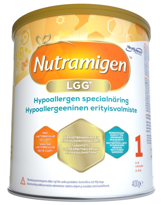 Nutramigen 1 LGG är en hypoallergen modersmjölksersättning som används för kostbehandling av komjölksproteinallergi, sojaproteinallergi, laktosintolerans. Med probiotika (LGG).