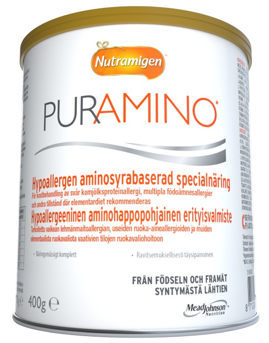Bröstmjölk är spädbarnets bästa föda. Nutramigen Puramino är ett livsmedel för speciella medicinska ändamål och skall endast användas på inrådan av läkare eller dietist.
