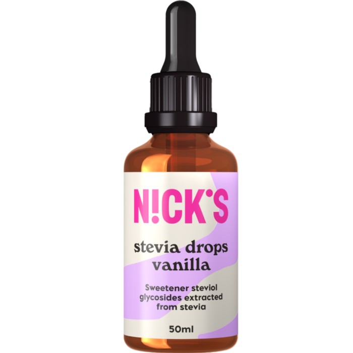 Nicks Stevia Drops Vanilla är ett sötningsmedel med vaniljsmak. Kan blandas i mjölk, yoghurt, kaffe eller vatten. Nicks Stevia Drops innehåller inte några kolhydrater, socker eller kalorier. Innehåller sötningsmedel.