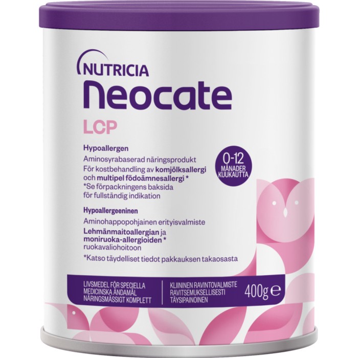 INGREDIENSER Torkad glukossirap, raffinerade vegetabiliska oljor (ickehydrerad kokosolja, solrosolja med hög andel oljesyra, solrosolja, rapsolja), Larginin-L-as-partat, L-leucin, L-lysinacetat, L-glutamin, L-prolin, emulgeringsmedel (E472c), L-valin, glycin, L-isoleucin, dikaliumvätefosfat, L-treonin, L-fe-nylalanin, L-tyrosin, L-serin, L-histidin, L-alanin, dibasisk kaliciumfosfat, natriumklorid, trikaliumcitrat, L-cystin, Ltryptofan, kalciumkarbonat, trikalciumcitrat, magnesiumklorid, kolinbitartrat, kalciumglycerofosfat, L-metionin, tribasisk kalciumfosfat, arakidonsyrarik olja från Mortiella Alpina, mag nesium-L-aspartat, dokosahexaensyrarik olja från Crypthecodinium cohnii, M-inositol, Laskorbinsyra, taurin, järnsulfat, zinksulfat, L-karnitin, uridin 5’- monofosfatnatriumsalt, cytidin-5’-monofosfat, nikotinamid, inosin-5’- monofosfatdinatriumsalt, adenosin-5’-monofosfat, kalcium-Dpantotenat, guanosin-5’-mono-fosfatdinatriumsalt, antioxidanter (E304, E307, E306), DL-a-tokoferyl- acetat, kopparsulfat, tiaminhydroklorid, pyridoxinhydroklorid, riboflavin, mangansulfat, retinylacetat, kaliumjodid, folsyra, kromklorid, vitamin K1, natriumselenit, natriummolybdat, D-biotin, vitamin D3, cyanokobalamin. Neocate Syneo Neocate LCP Neocate Spoon Neocate Junior Näringsvärde per 100 g pulver / per 100 ml färdig lösning (14,7 g pulver) / per 100 g pulver / per 100 ml färdig lösning (13,8 g pulver) / per 100 g pulver / per 100 g färdig lösning (37 g pulver) / per 100 g pulver / per 100 ml färdig lösning 21,1% spädning Energi KJ 1941 285 2020 279 1981 733 1992 420 Kcal 464 68,2 483 67 472 175 475 100 Fett g (E%) 23,0 3,4 24,5 (46) 3,4 (46) 18,8 (36) 7 (36) 22,0 4,6 varav g 9,7 1,4 8,9 1,2 6,9 2,6 9,4 2,0 g 7,8 1,1 9,6 1,3 7,5 2,8 7,7 1,6 g 4,5 0,66 4,8 0,66 3,5 1,3 4,0 0,84 mg 77,0 11,3 81,6 11,3 – – – – mg 77,0 11,3 81,6 11,3 – – – – % 67 67 96 96 96 96 65 65 % 33 33 4 4 4 4 35 35 – mättat fett – enkelomättat fett – fleromättat fett varav – Dokosahexaensyra (DHA) – Arakidonsyra (ARA) LCT MCT Förhållandet n-6:n-3 9:1 9:1 9:1 9:1 10:1 10:1 10:1 10:1 Kolhydrat g (E%) 49,0 7,2 52,5 (43) 7,2 (43) 67,4 (57) 24,9 (57) 56,0 11,8 varav sockerarter g 4,6 0,68 4,7 0,65 12,3 4,6 5,0 1,1 – därav glukos g 1,0 0,5 1,0 0,14 0,81 0,30 1,1 0,23 – därav laktos g – – – – – – – – – därav maltos g 3,4 0,50 3,7 0,51 2,8 1,0 3,9 0,82 – därav maltotrios g 4,9 0,72 5,3 0,73 4,0 1,5 5,6 1,2 varav polysackarider g 45,4 9,6 Fiber g 4,5 0,66 – – – – – – Proteinekvivalenter g (E%) 13,0 1,9 13 (11) 1,8 (11) 8,2 (7) 3,0 (7) 13,3 2,8 Salt g 0,45 0,07 0,47 0,07 0,11 0,04 0,71 0,15 Mineraler Natrium mg (mmol) 181 26,6 189 (8,2) 26,1 (1,1) 42 (1,8) 15,5 (0,67 285 (12,4) 60,1 (2,6) Kalium mg (mmol) 505 74,2 525 (13,4) 72,5 (1,8) <20 (<1,0) <10 (<0,50) 546 (14,0) 115 (2,9) Klorid mg (mmol) 370 54,4 386 (10,9) 53,3 (1,5) 48 (1,4) 17,8 (0,52) 437 (12,3) 92,2 (2,6) Kalcium mg (mmol) 538 79,1 475 (11,8) 65,6 (1,6) 716 (17,9) 265 (6,6) 428 (10,7) 90,3 (2,3) Fosfor mg (mmol) 381 56,0 341 (11,0) 47,1 (1,5) 377 (12,2) 139 (4,5) 309 (10,0) 65,2 (2,1) Magnesium mg (mmol) 49,2 7,2 51 (2,1) 7,0 (0,29) 23,1 (0,96) 8,5 (0,35) 66,5 (2,7) 14,0 (0,57) Ca/P kvot 1,4 1,4 1,4 1,4 1,4 1,4 Järn mg 6,9 1,0 7,3 1 6,5 2,4 5,7 1,2 Koppar mg 0,39 0,06 0,41 0,057 0,34 0,13 0,48 0,1 Zink mg 5,1 0,75 5,3 0,73 4,5 1,7 5,2 1,1 Mangan mg 0,19 0,03 0,20 0,03 0,34 0,13 0,29 0,06 Jod µg 95,6 14,1 100 13,8 41,4 15,3 71,3 15,0 Molybden µg 10,7 1,6 11,3 1,6 9,7 3,6 21,4 4,5 Selen µg 13,8 2,0 14,5 2,0 12,4 4,6 15,2 3,2 Krom µg 10,1 1,5 10,6 1,5 11 4,1 7,6 1,6 Vitaminer Vitamin A µg 390 57,3 406 56 195 72,2 214 45,2 Vitamin D3 µg 8,4 1,2 8,8 1,2 4,3 1,6 6,2 1,3 Vitamin E mg (a-TE/ET) 4,3 0,63 4,8 0,67 2,3 0,84 6,7 1,4 Vitamin C mg 49,6 7,3 51,6 7,1 23 8,5 47,5 10,0 Vitamin K µg 40,8 6,0 42,5 5,9 18,5 6,8 19,0 4,0 Tiamin mg 0,54 0,08 0,54 0,07 0,25 0,09 0,48 0,10 Riboflavin mg 0,54 0,08 0,54 0,07 0,25 0,09 0,95 0,20 Niacin mg 4,7 0,69 10,2 1,4 3,9 1,5 5,3 1,1 Vitamin B6 mg 0,54 0,08 0,54 0,07 0,25 0,09 0,48 0,10 Folsyra µg 62,7 9,2 64 8,8 27,5 10,2 71,3 15,0 Vitamin B12 µg 1,3 0,19 1,3 0,18 0,6 0,22 1,2 0,25 Biotin µg 18,1 2,7 19 2,6 9,1 3,4 14,3 3,0 Pantotensyra mg 2,8 0,41 2,9 0,4 1,4 0,52 1,9 0,40 Övriga näringsämnen Kolin mg 91,9 13,5 95,4 13,2 45 16,7 95,0 20,0 Inositol mg 104 15,3 108 14,9 49 18,1 26,1 5,5 L-karnitin mg 9,5 1,4 9,5 1,3 5,9 2,2 15,80 3,3 Taurin mg 30 4,4 30 4,1 15,9 5,9 31,45 6,6 Nukleotider mg 23,3 3,4 23,3 3,2 – – – – Neocate Junior är halal-certifierad.