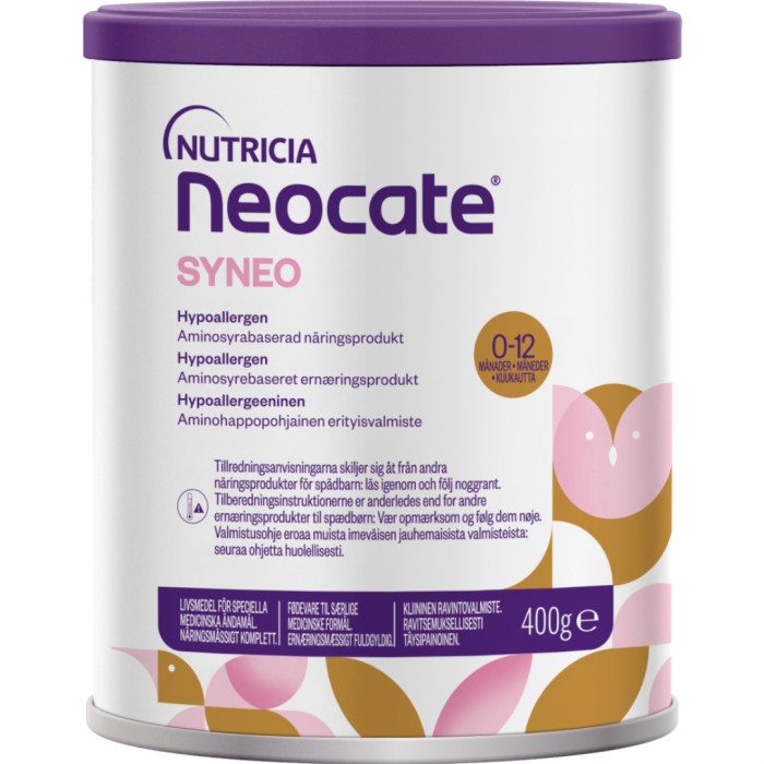 Neocate Syneo är en aminosyrabaserad näringsmässigt komplett modersmjölksersättning avsedd för kostbehandling av spädbarn 0–1 år. Innehåller pre- och probiotika (frukto-oligosackarider och Bifidobacterium breve M-16V), långkedjiga fettsyror (LCP) och nukleotider.
