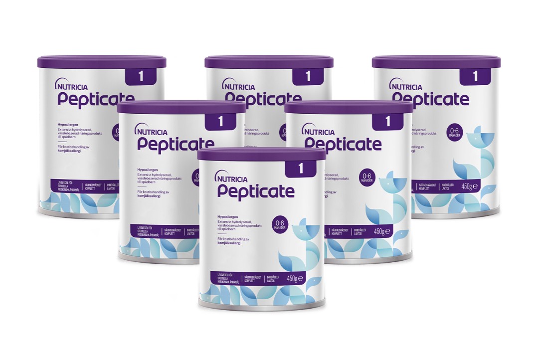 Pepticate är livsmedel för speciella medicinska ändamål vid kostbehandling av mjölkproteinallergi. Ska användas på inrådan av sjukvårdspersonal. Ta alltid kontakt med sjukvården om du misstänker att ditt barn har mjölkproteinallergi. Amning rekommenderas de första 6 månaderna. Om man inte kan eller vill amma helt eller delvis finns det modersmjölksersättning. Rådgör alltid med din BVC om du behöver råd och stöd kring barnets mat.
