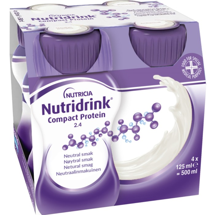 Nutridrink Compact Protein är en protein- och energirik näring i liten volym (125 ml). Nutridrink Compact Protein har ett högt proteininnehåll och är avsedd att användas som komplement till den vanliga maten, och ger mycket näring i liten volym. Denna dryck har en neutral smak.