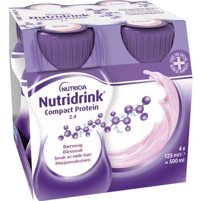 Nutridrink Compact Protein är protein- och energirik näring i liten volym (125 ml). Nutridrink Compact Protein har ett högt proteininnehåll och är avsedd att användas som komplement till den vanliga maten. Ger mycket näring i liten volym.