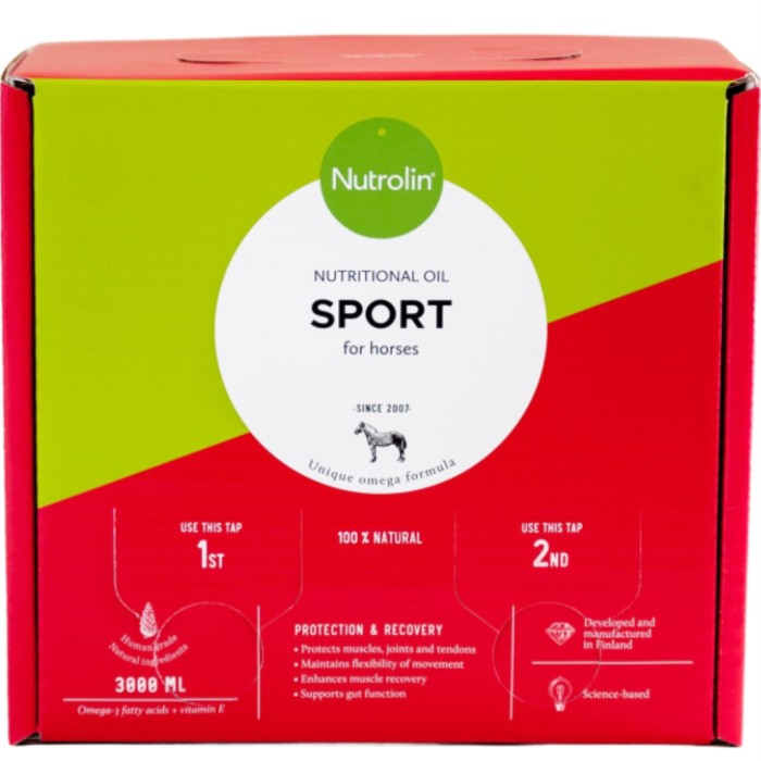 Nutrolin Sport Nutritional Oil for Horses är en näringsolja för häst. Innehåller fiskoljans omega-3-fettsyror och E-vitamin i en effektiv kombination för hästar i hårt arbete. Skyddar muskler, leder och senor. Upprätthåller smidiga rörelser. Ger musklerna bättre återhämtning. Stödjer tarmfunktionen. Ett enkelt tillskott i fodret för dagligt bruk. Nutrolin® HORSE Sport innehåller lecitin. Lecitin innehåller rikligt med fosfokolin som stödjer matsmältningskanalens välmående och funktion. Utvecklad och tillverkad i Finland.