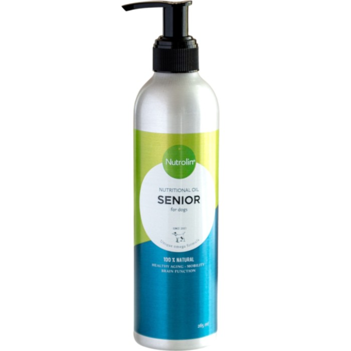 Nutrolin Nutritional Oil Senior for Dogs stödjer den äldre hundens rörlighet, hjärnans funktioner och immunförsvaret. Oljan innehåller höga halter av omega-3 EPA- och DHA-fettsyror. Stödjer hjärnans, ögonens, ledernas och musklernas funktioner. Oljan innehåller tillsatt fosfokolin för matsmältningskanalens stöd, och passar även för hundar med känslig mage. Innehåller D-vitamin för att upprätthålla tändernas och benstommens funktioner.