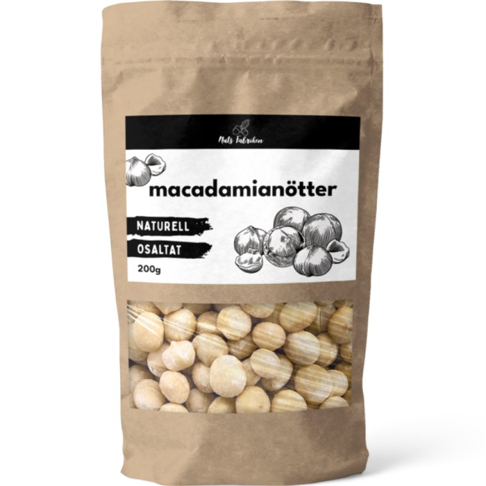 Nuts Fabriken premium macadamianötter är goda att äta som en snack och innehåller fettsyror och antioxidanter. Du kan avnjuta nötterna direkt från påsen eller använda dem som en ingrediens i bakning eller matlagning.