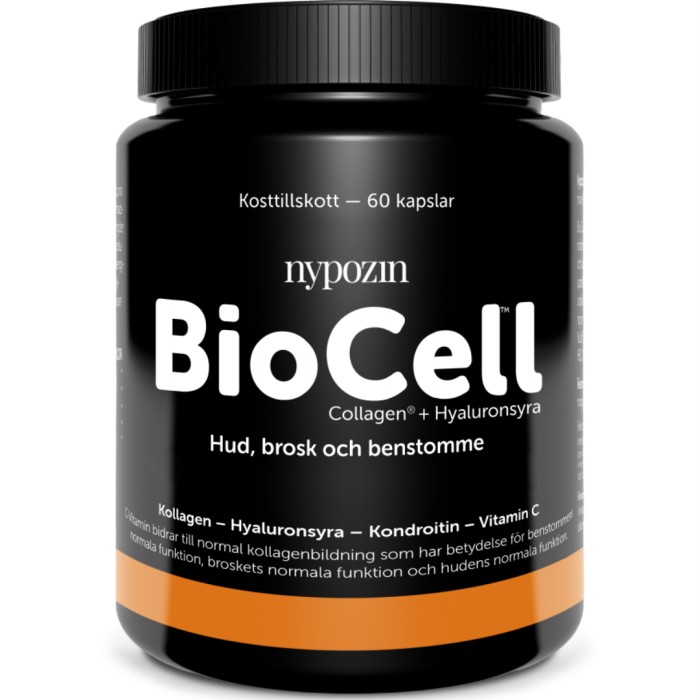 Nypozin BioCell Collagen® + Hyaluronsyra är ett kosttillskott med vitamin C och Actamide, ett kosttillskott framtaget för aktiva människor. Nypozin BioCell innehåller vitamin C som bidrar till normal kollagenbildning och har betydelse för benstommens normala funktion, broskets normala funktion och hudens normala funktion. Innehåller också svartpeppar (Piper nigrum L.).