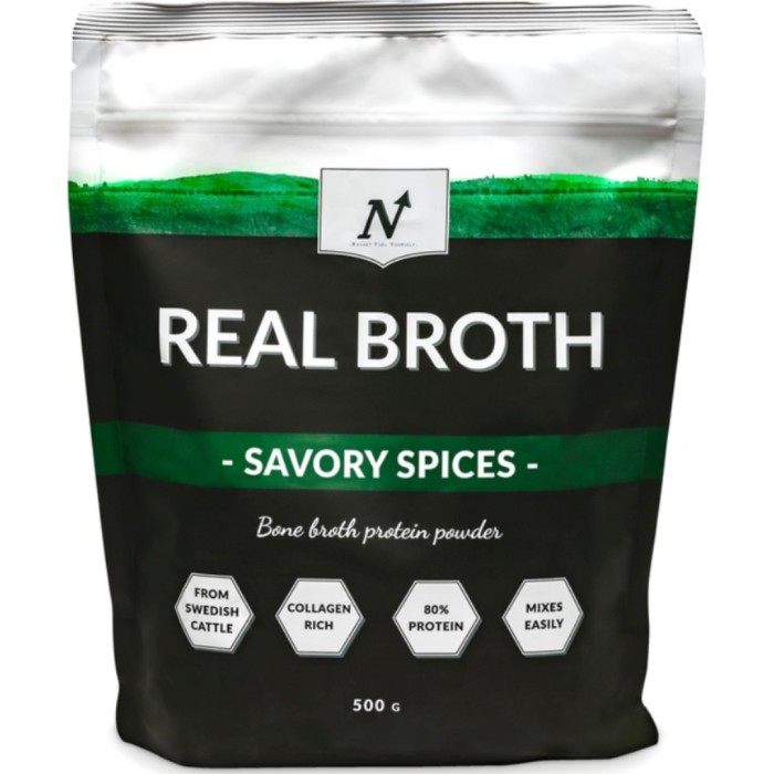 Real Broth Spices är smaksatt med klassiska kryddor för hemkokade buljonger, som havssalt, lökpulver, vitlökspulver, svartpeppar, gurkmeja och persilja och har en rik smak. Pulvret kan blandas i båda kalla och varma vätskor. Denna variant (Savory Spices) gör sig bäst i grytor eller soppor, eller som en kopp buljong med uppkokat vatten.