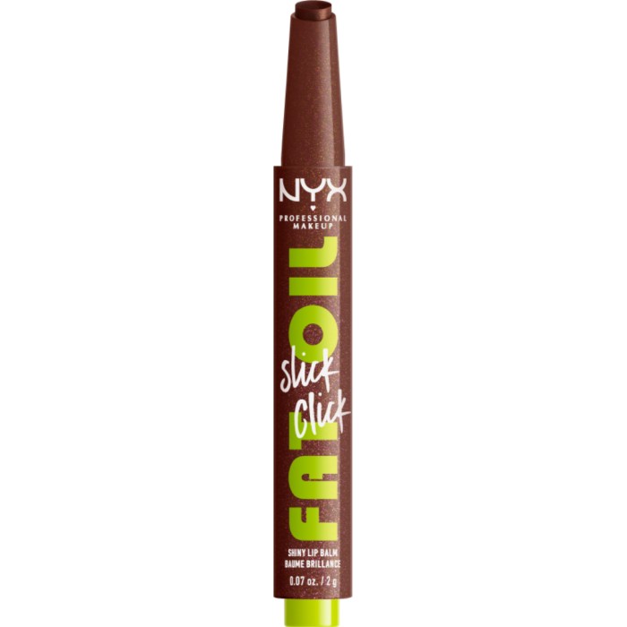 NYX Fat Oil Slick Click är ett pigmenterat läppbalsam som med bara ett "klick" ger en precis rätt mängd till dina läppar. Fat Oil Slick Click har en vegansk formulering och vårdar och ger färg till dina läppar. Detta läppbalsam från NYX Professional Makeup är berikat med avokado-, hjorton- och hallonolja. Ger 12 timmars fukt till läpparna. Berikad med oljor och superlätta pigment för en fin och diskret färg. Superglansig finish som inte klibbar. Vegansk formulering (utan ingredienser av animaliskt ursprung).