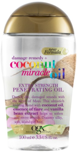OGX Coconut Miracle Extra Strength Penetrating Oil är en hårolja som ger glans till torrt och skadat hår. Oljan är extra koncentrerad och innehåller kokosnötolja, tiarreessens och vaniljbönextrakt. Den går djupt in i hårstrået och det räcker med några droppar i handdukstorkat hår för att göra håret mjukare och vårda torra och skadade hårstrån. Hjälper dig att motverka frissigt hår.