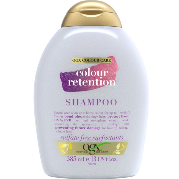 OGX Colour Retention Shampoo är ett hårschampo som förlänger färgintensiteten i färgat hår i upp till 4 veckor. Schampot är djupt återfuktande och är formulerat med Colour Bond Plex-teknologi för att skydda håret mot solens UVA/UVB-strålar. Samtidigt stärker det hårstråna och hjälper till att förhindra framtida skador. Colour Retention är framtagen för att ge ett hår som känns friskt och livfullt färgat.