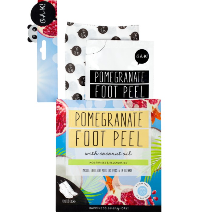 Oh K! Pomegranate & Coconut Oil Peeling Foot Mask är en peelande "fotmask" i form av ett par strumporna som du fyller med den medförjande vätskan. Vätskan innehåller granatäpple för en fräsch och slät hud, och kokosoljan som hjälper till att återfukta huden och göra fötterna mjuka. Fotmasken innehåller fruktberikad AHA för att ta bort döda hudceller samt ge näring till och mjuka upp huden. Ha strumporna på i 1 - 1,5 timme och tvätta sedan av rester från fötterna. Fötterna kommer börja flagna efter 4-7 dagar.