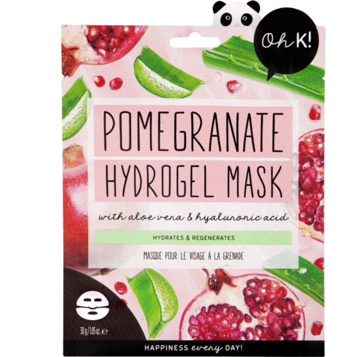 Oh K! Pomegranate & Hyaluronic Hydrogel Mask är en återfuktande hydrogel-ansiktsmask som är berikad med hyaluronsyra för att ge huden fukt och lyster. Granatäpplet i hydrogelen ger huden en fräsch och len boost medan aloe vera har lugnande och svalkande effekt.