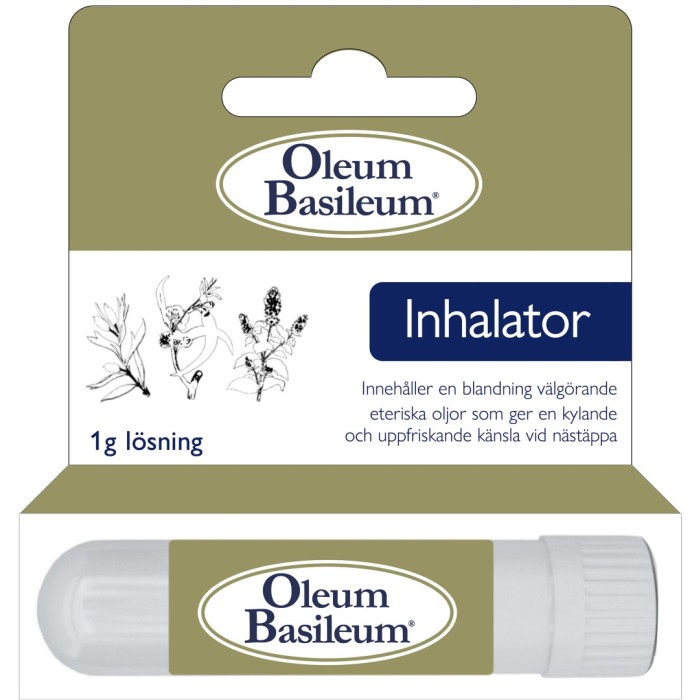Oleum Basileum® inhalator är ett inhalationsstift med eteriska oljor som ger en kylande och uppfriskande känsla vid nästäppa. Den smidga lilla inhalatorn är lätt att använda och lätt att ha med sig. Det 100% naturliga innehållet består av sju olika eteriska oljor från eukalyptus, pepparmynta, kajeput, mentol, vintergröna, enbär och kryddnejlika.