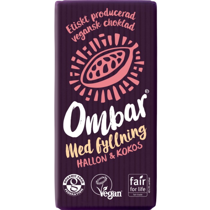 Ombar med fyllning Hallon & Kokos är en liten chokladkaka som är ekologisk, vegan och raw.