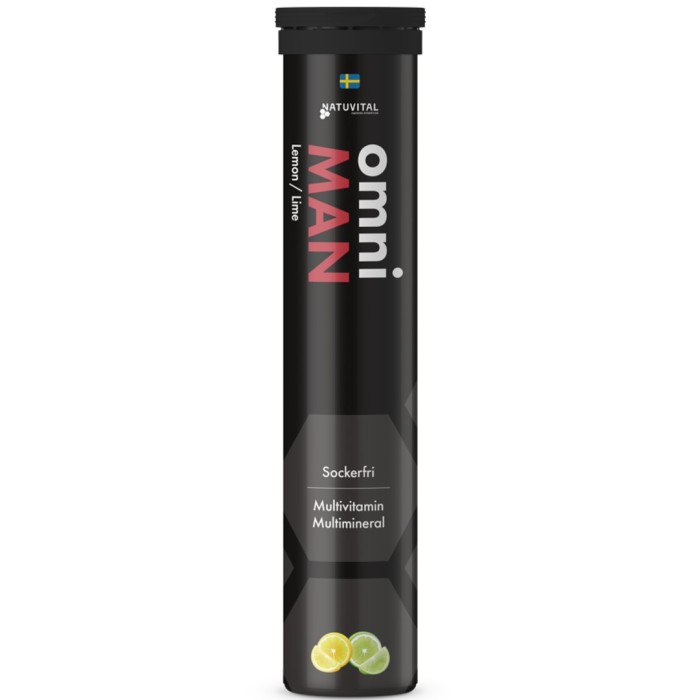Omni Man Multivitamin är ett kosttillskott med 13 vitaminer och 9 mineraler särskilt anpassat för män. Innehåller vitaminerna A, B1, B2, B3, B5, B6, B7, B9, B12, C, D, E, K och mineralerna magnesium, zink, kalcium, mangan, koppar, krom, jod, molybden och selen. Lös upp en brustablett i ett glas vatten.
