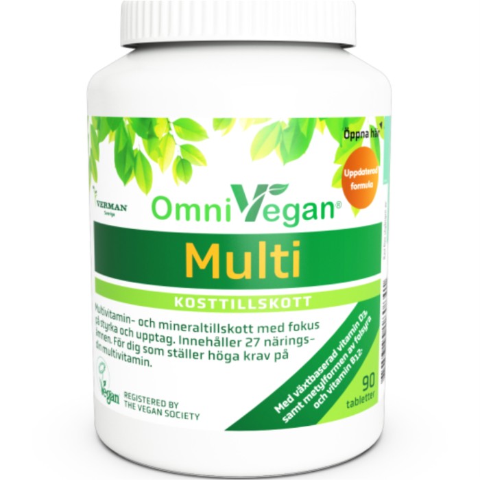 OmniVegan Multi är ett kosttillskott som innehåller 27 vitaminer, mineraler och andra näringsämnen. I OmniVegan Multi ingår vitamin A i form av retinylacetate, ett ämne som inte behöver omvandlas i kroppen utan kan tas upp direkt. Naturlig vitamin E ingår också, och växtbaserad vitamin D3 från alger samt ett bredspektrum av K-vitaminer. (Innehåller både vitamin K1 och K2.) OmniVegan Multi innehåller B-vitaminer i metylerade former. Detta gäller B12 samt folsyra. Dessa aktiva former behöver inte omvandlas i kroppen utan kan tas upp direkt. OmniVegan innehåller flera former av organiskt bundna mineraler, bl a bisglycinatformen i zink, mangan och järn samt pikolinat formen i krom samt jästformen i selen. Kalcium ingår i en naturlig form från alger. Andra ämnen i detta kosttillskott är bl a inositol, bor, kisel från bambu samt kolin. Tabletternas skyddande hölje har en grön färg som kommer från en kombination av äpple, spirulina, safflor och citron. OmniVegan Multi är registrerad vid The Vegan Society.
