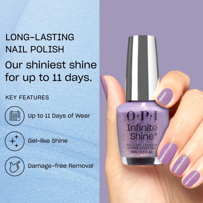 OPI Infinite Shine har en banbrytande formulering med en förhärdad gelteknologi som ger glans, täckning och en långvarig hållbarhet i upp till 11 dagar. Den gelliknande formuleringen omsluter naglarna för en slät och jämn täckning utan ränder eller bubblor, och avlägsnas enkelt med aceton. Så bra att du kanske tror att det är gel. Infinite Shine är framtagen för att ge dig allt du älskar med gel - och allt du älskar med lack.