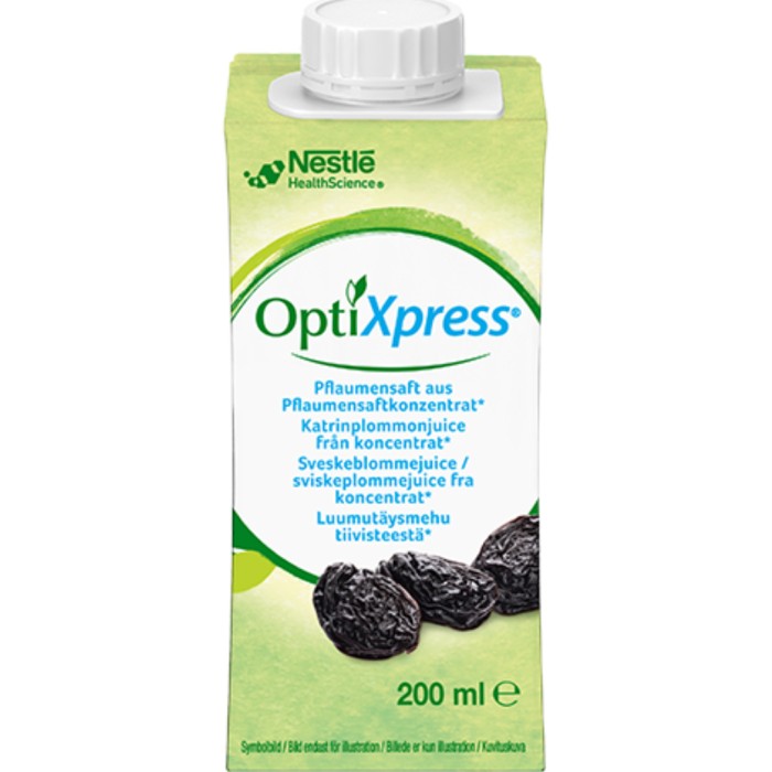 OptiXpress Katrinplommonjuice är en drickfärdig juice av katrinplommonkoncentrat gjort av torkade plommon. UHT-behandlad.