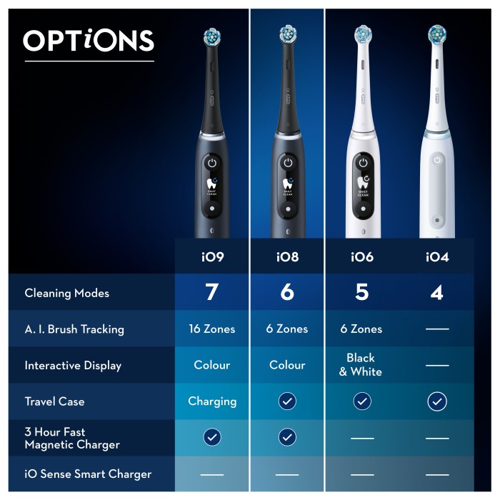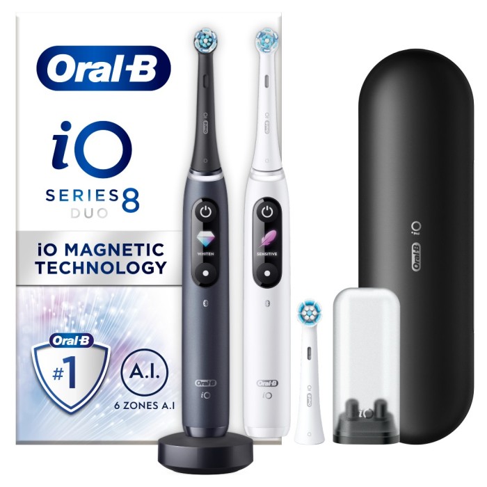 - Innehåll: 2 iO8-handtag med 3 borsthuvuden, 1 premiumresefodral, 1 laddare, 1 hållare för borsthuvud