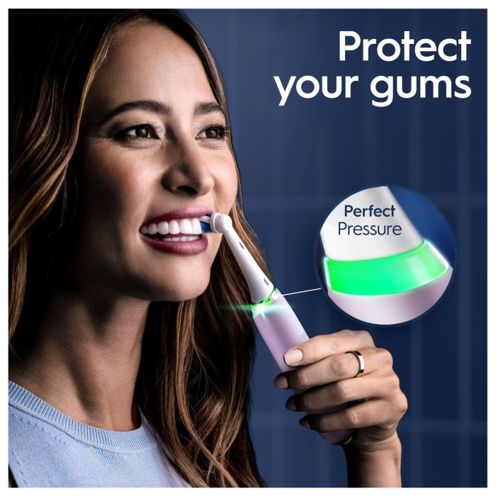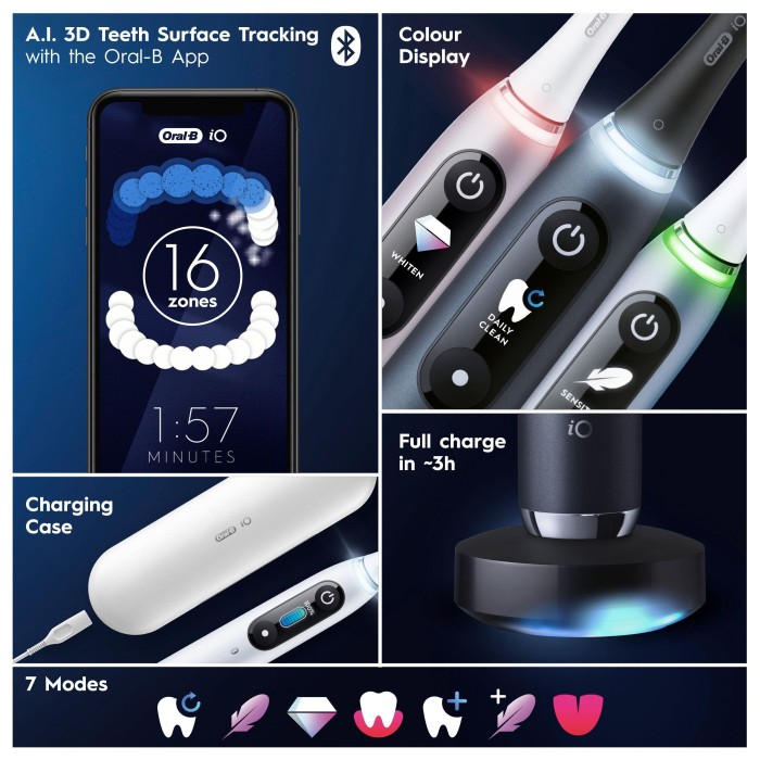Oral-B:s innovativa AI-positionsdetektering följer var du borstar på alla 3 tandytorna. 8 av 10 personer upplevde bättre tandborstning tack vare vägledningen från iO på bara en vecka. Smart borstning med en interaktiv färgskärm - du kan välja mellan 7 rengöringslägen och den mäter tiden på din tandborstning för en riktigt bra rengöring. IO-trycksensorn signalerar om du borstar för hårt, för mjukt eller med lagom tryck - för en effektiv och säker rengöring. Laddningsbart resefodral och 3-timmars snabbladdare. Skärmen visar batterinivån.