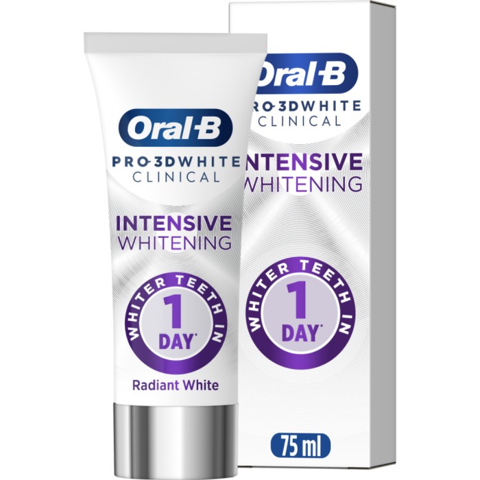 Oral-B Pro 3D White Clinical Intensive Whitening är en tandkräm som kliniskt bevisat ger vitare tänder på en dag genom att ta bort ytliga missfärgningar på tänderna. Detta är den tandkräm som Oral-B:s kallar sin bästa vitgörande tandkräm med en unik jonisk teknologi. Tandkrämen löser upp fläckar utan att skrubba, tar bort fläckar med jonisk vitgörande effekt, skyddar tänderna mot framtida fläckar och är lämplig för känsliga tänder. Tandkrämen har en frisk mintsmak.