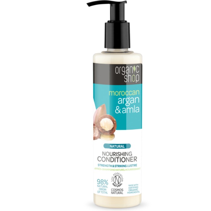 Moroccan Argan & Amla Nourishing Conditioner från Organic Shop är ett hårbalsam med arganolja och amla som ger näring till skadat hår. Detta rika balsam hjälper till att reparera och ge näring till skadat hår, vilket ger håret vitalitet och glans. Den akologiska marockanska arganoljan innehåller antioxidanter, essentiella fettsyror och vitamin E, och bidrar till att öka hårets elasticitet för att återställa matt, livlöst hår. Ekologiskt amla-extrakt ger håret mycket glans. Balsamet bidrar till att reparera styling- och värmeskador.