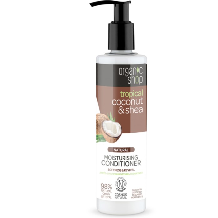 Coconut & Shea Moisturising Conditioner från Organic Shop är ett hårbalsam som återfuktar håret från rot till topp. Kokos- och sheabalsamet innehåller ekologisk kokos som vårdar torrt och skadat hår och ger näring till hårstråna, och ger håret glans. Ekologisk shea ger håret en fuktboost för att reparera kluvna toppar och gör att håret känns mjukt.