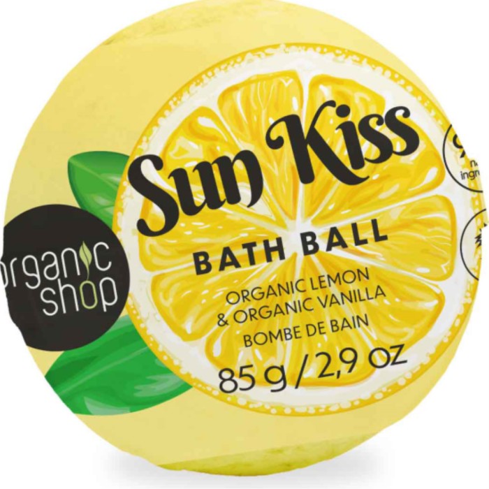 Organic Shop Sun Kiss Bath Ball är en badbomb med doft av citron och vanilj. Denna uppfriskande och avkopplande badbomb har berikats med ekologiskt citronextrakt och vaniljextrakt. Tillför kanske en skönt rogivande doft till badet, och hjälper till att göra huden återfuktad och ge den lyster.