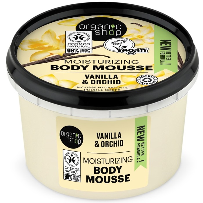 Moisturizing Body Mousse Vanilla Orchid från märket Organic Shop skämmer bort din hud. Denna kroppsmousse innehåller extrakt av ekologisk vanilj och orkidéer, vilket ger den en härlig och ojämförlig doft. Hudkrämen har en lätt konsistens och återfuktar huden.