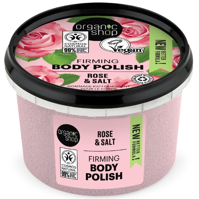 Firming Body Polish Rose & Salt från Organic Shop är en kroppsscrub med ekologisk roshydrolat och salt. Skrubbkrämen peelar huden och gör att huden känns uppfräschad.