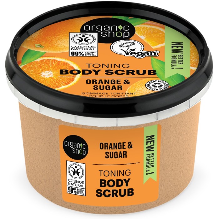 Toning Body Scrub Orange från Organic Shop är en tonande kroppsskrubb med socker och apelsinolja.
