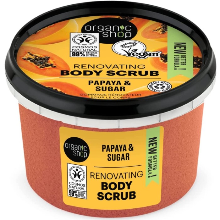 Organic Shop Renovating Body Scrub Papaya är en kroppsskrubb med ekologiskt papayaextrakt och socker. Skrubben exfolierar och rengör din hud, samtidigt som den tar bort döda hudceller och har en härligt fruktig doft.
