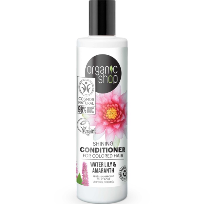 Shining Conditioner Water Lily & Amaranth från Organic Shop är ett balsam framtaget för färgat hår. Balsamet innehåller ekologisk amarantolja som ger håret glans och hjälper håret att bevara sin färg. Näckrosextrakt ger näring åt håret och jämnar ut dess naturliga struktur.