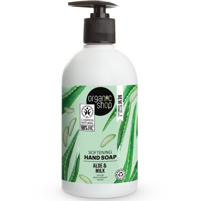 Organic Shop Hand Soap Aloe & Milk är en flytande handtvål som rengör dina händer utan att torka ut huden. Organic Shop Softening handtvål innehåller ekologiska extrakt från aloe vera samt mjölkproteiner för att ge näring till huden och göra att huden känns smidig.